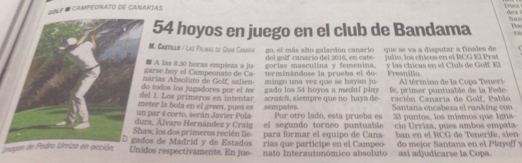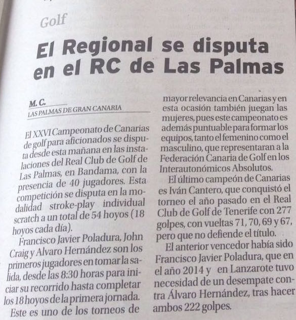 El Real Club de Golf de Las Palmas, acoge este fin de semana - del 03 al 05 de junio - el Campeonato de Canarias Amateur Masculino y Femenino 2016. Una prueba organizada por la Federación Canaria de Golf y valedera para formar parte del equipo canario en el Interautonómico Absoluto Masculino a celebrar en el RCG del Prat del 25 al 29 de julio de 2016 y Absoluto Femenino de 1ª y 2ª División a celebrar en el Fresnillo del 27 al 30 de julio de 2016.02 de junio de 2016